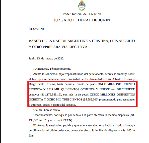LA DEUDA QUE TENIA CON EL BANCO NACION DONDE ESTUVO EMBARGADO E INHIBIDO POR 15 MILLONES DE PESOS