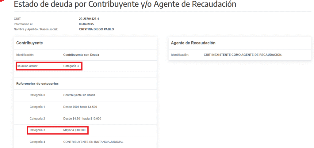 En otro orden el primer candidato a concejal por la lista de La Libertad Avanza de Junín Diego Cristina le debe al fisco Provincial Arba estando en situación categoría 3 prejudicial.