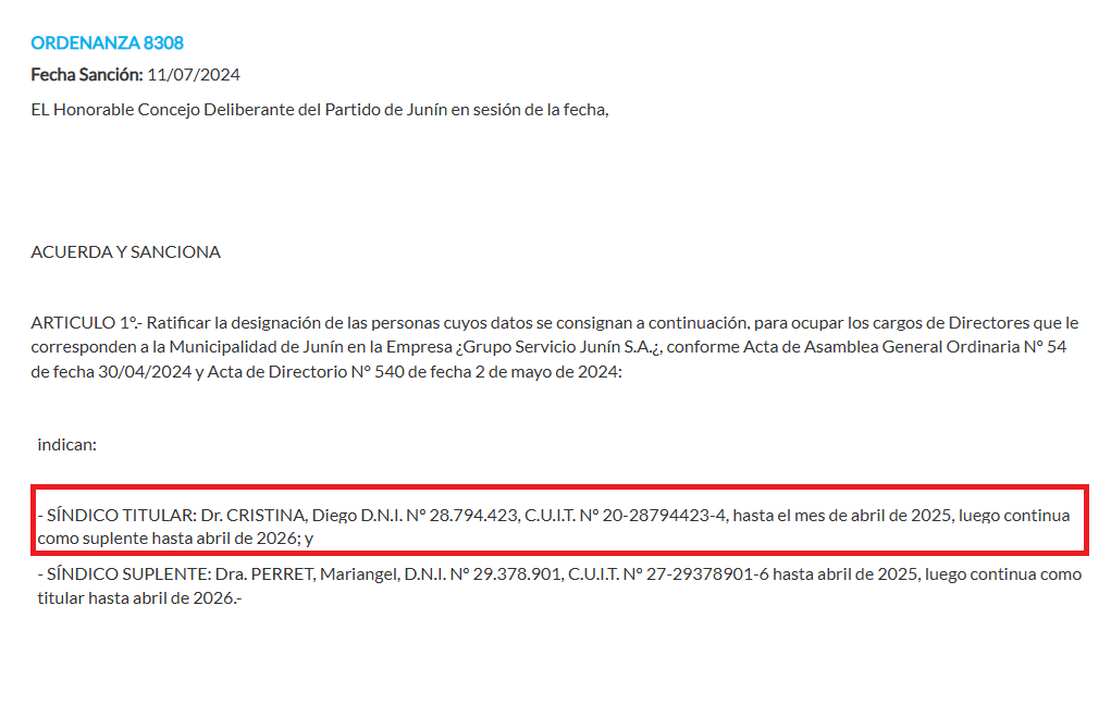 El nombramiento de sindico en el Grupo Gas Junín que depende del municipio fue por el decreto municipal ordenanza 8308 con el alta de fecha del mes de abril del 2025 hasta abril 2026.